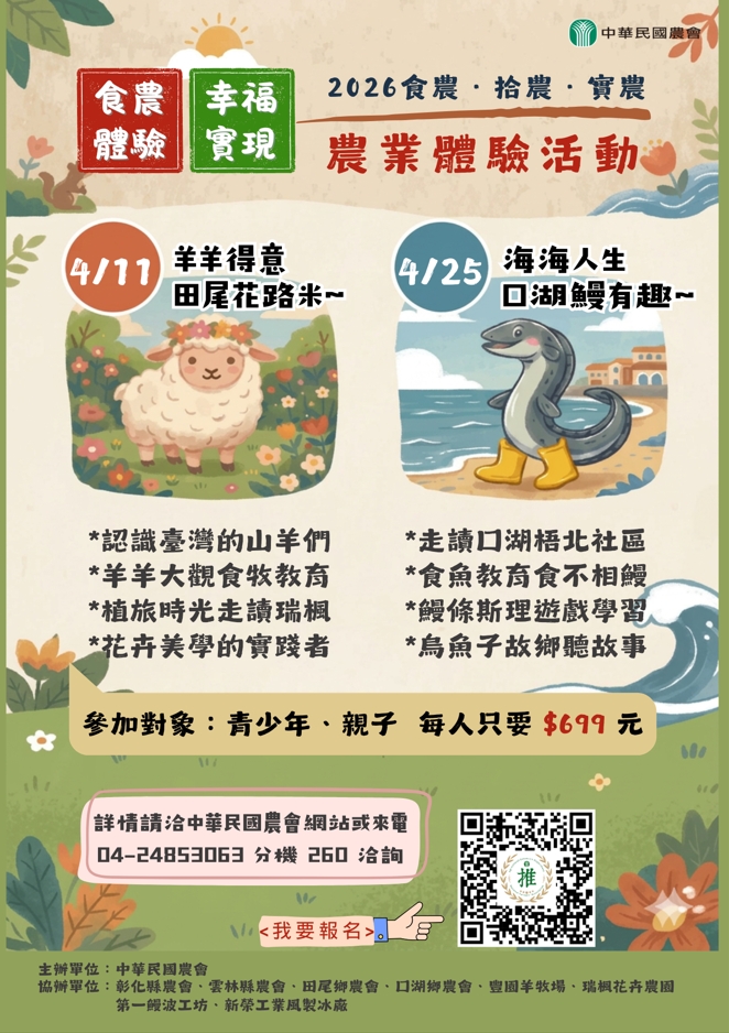 中華民國農會訂於4月11日、25日辦理2026上半年度「食農體驗,幸福實現」農業體驗活動二梯次,有興趣者請踴躍報名參加。