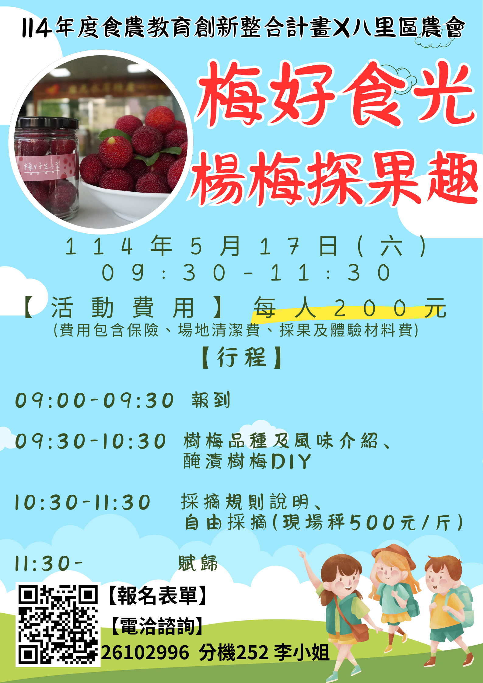 八里區農會辦理114年度食農教育創新整合計畫「梅好食光樹梅探果趣」食農體驗活動,有興趣者請踴躍報名參加。