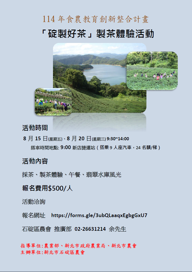 石碇區農會辦理114年度食農教育創新整合計畫-「碇製好茶」製茶體驗活動,請有興趣者踴躍報名參加。
