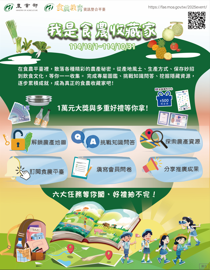 農業部食農教育資訊整合平臺訂於114年10月1日至10月31日辦理「我是食農收藏家」推廣活動有興趣者請踴躍參加!